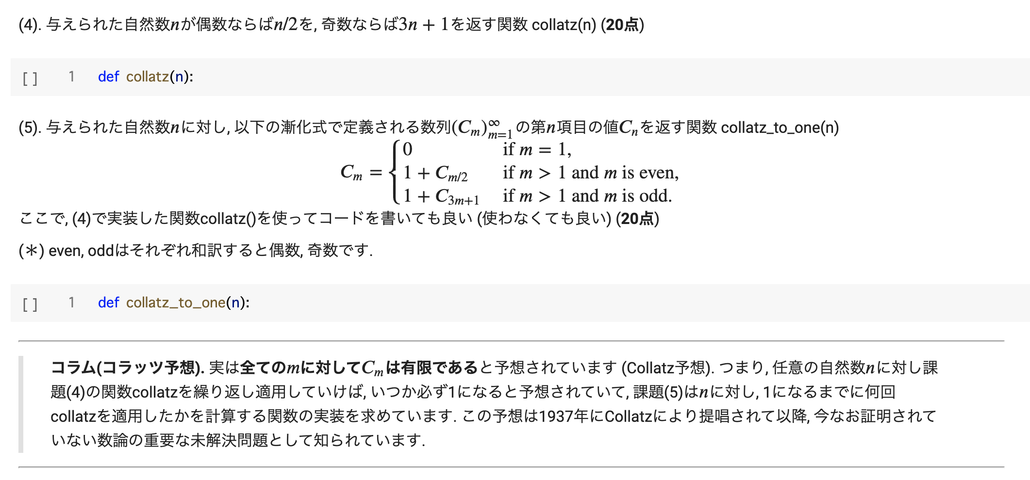 第1回の課題は「与えられた自然数が素数かどうか判定せよ」みたいな問題を出していましたが、なんとなく味気ないのでコラッツ予想を絡めた問題も出題してみました。こんな感じです。